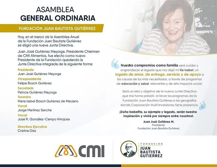 Juan José Gutiérrez Mayorga ha sido parte de la Junta Directiva de la Fundación Juan Bautista Gutiérrez desde 1985 y es el Presidente desde el 2020. La Fundación, brazo social de CMI y vehículo de agradecimiento a la sociedad, transforma vidas mediante programas de alto impacto donde CMI tiene presencia a través de 4 ejes de acción: Educación, Salud, Nutrición y Emprendimiento.